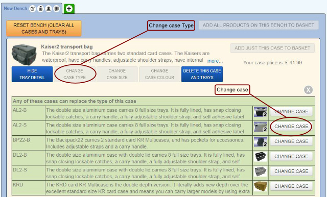 On your bench and above the case is a button 'Change Case Type', after you click this button, you can see a selection of cases in the same size that can be chosen instead of your current case. Click 'Change Case' next to the case you would like instead and then you are good to continue filling it with the trays that you need.
