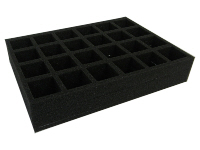Replacement Tray for Warhammer Classic plastic figure case. Carry 24 troops on 50mm bases, ideal for 2 squads of 10 troops on 40mm or 50mm bases up to 55mm tall, PLUS 4 HQ figures (24 figures total). 24 compartments 50mm x 50mm, 55mm deep. This tray replaces a standard Warhammer 36 compartment tray. This tray is 360mm x 265mm x 55mm. KR Reference ID: GW24H.