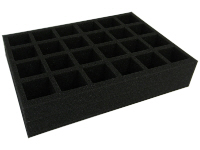 120 troops on 25mm bases, ideal for 12 squads of 10 troops on 25mm bases up to 50mm tall (120 figures total). 120 compartments 50mm x 25mm, 28mm deep .