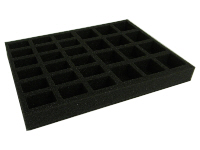 102 Troops on 25 - 32mm bases, ideal for 3 squads of 10 troops on 25 - 32mm bases up to 50mm tall, plus 4 HQ figures/very dynamically posed figures (34 figures total). 30 compartments 32mm x 50mm, and 4 compartments 50mm x 50mm, 32mm deep .